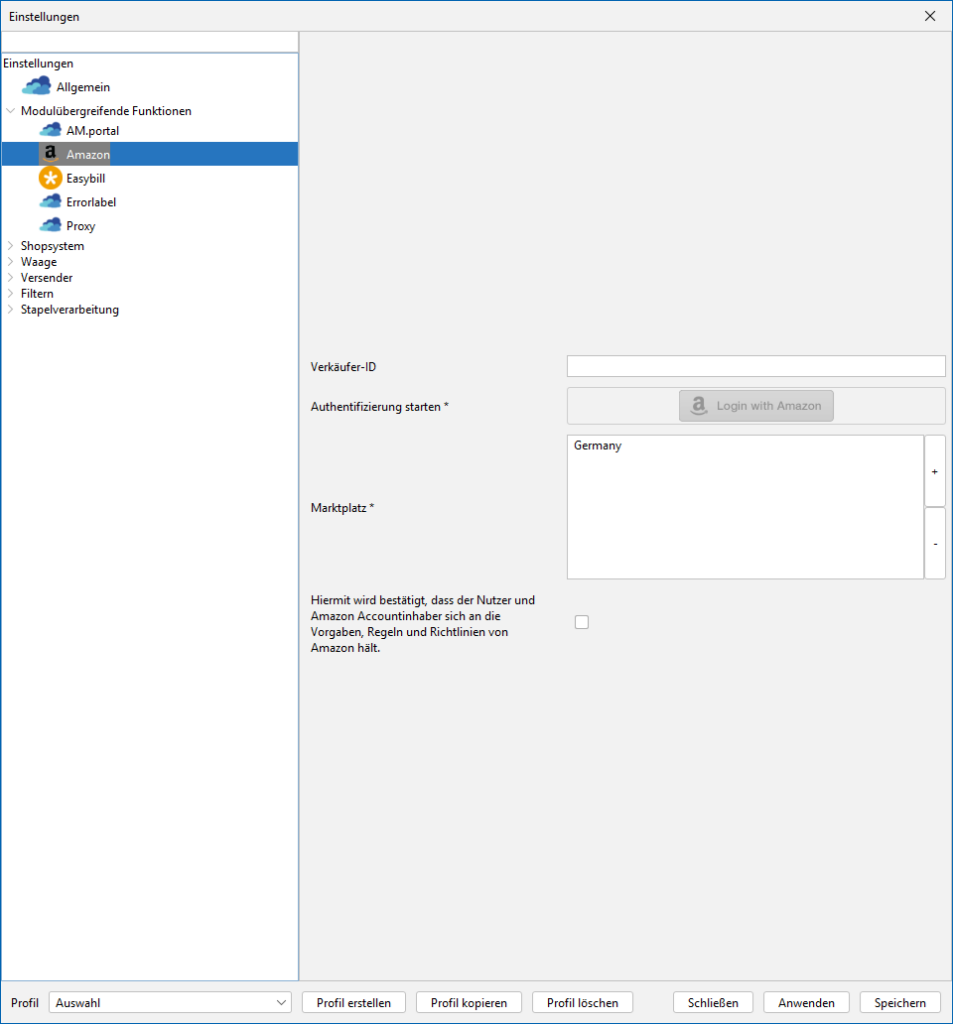 Dieses Modul wird ausschließlich zur Anmeldung an deinen Amazon-Account verwendet. Mit dieser Anmeldung funktionieren automatisch das Amazon-Shop-Modul, sowie die Amazon-Versender-Module.