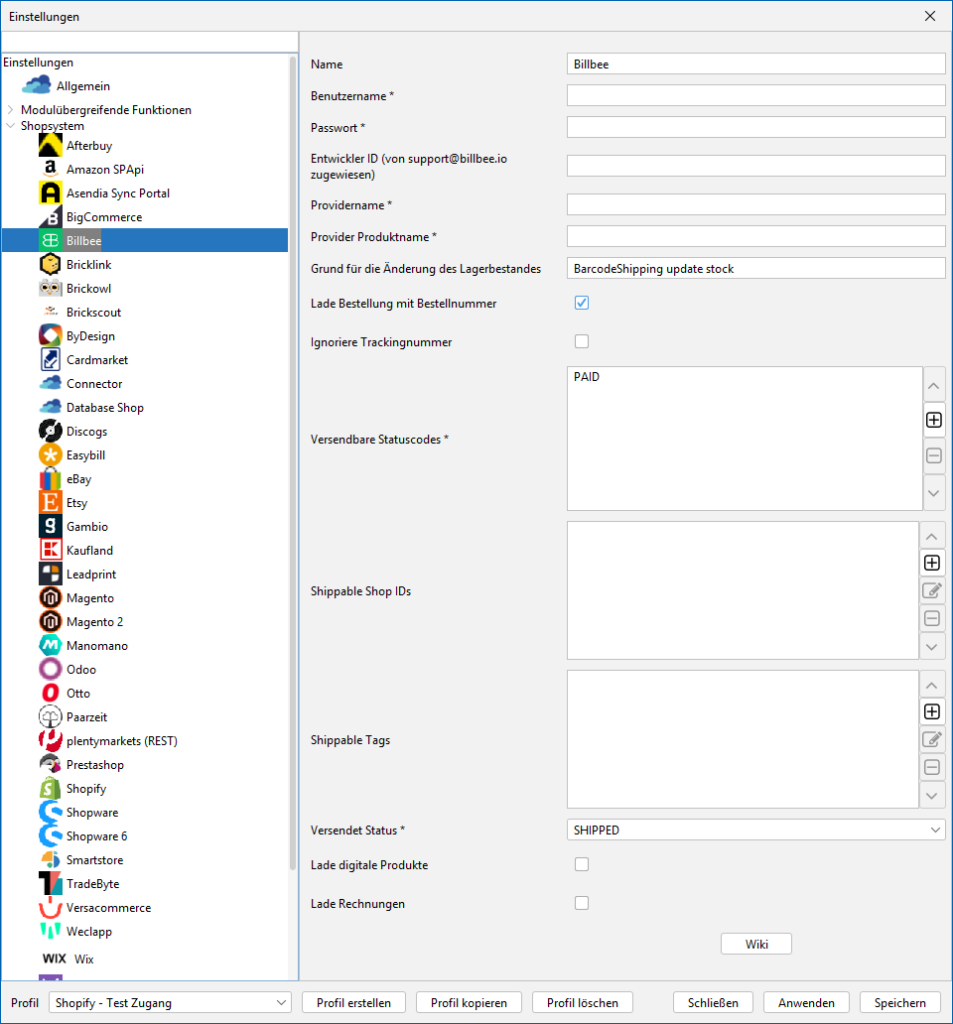 Schnittstelle in Billbee einrichten: