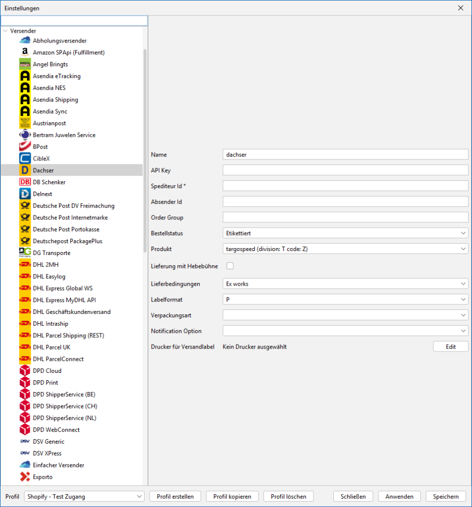 Wähle hier dein tariflich vereinbartes Dachser-Produkt aus. Hast du mehrere Tarife/Produkte bei Dachser abgeschlossen, so kannst du mit unserer Profilsteuerung weitere Profile anlegen, in denen du jeweils das entsprechende Dachser-Produkt konfigurieren kannst.