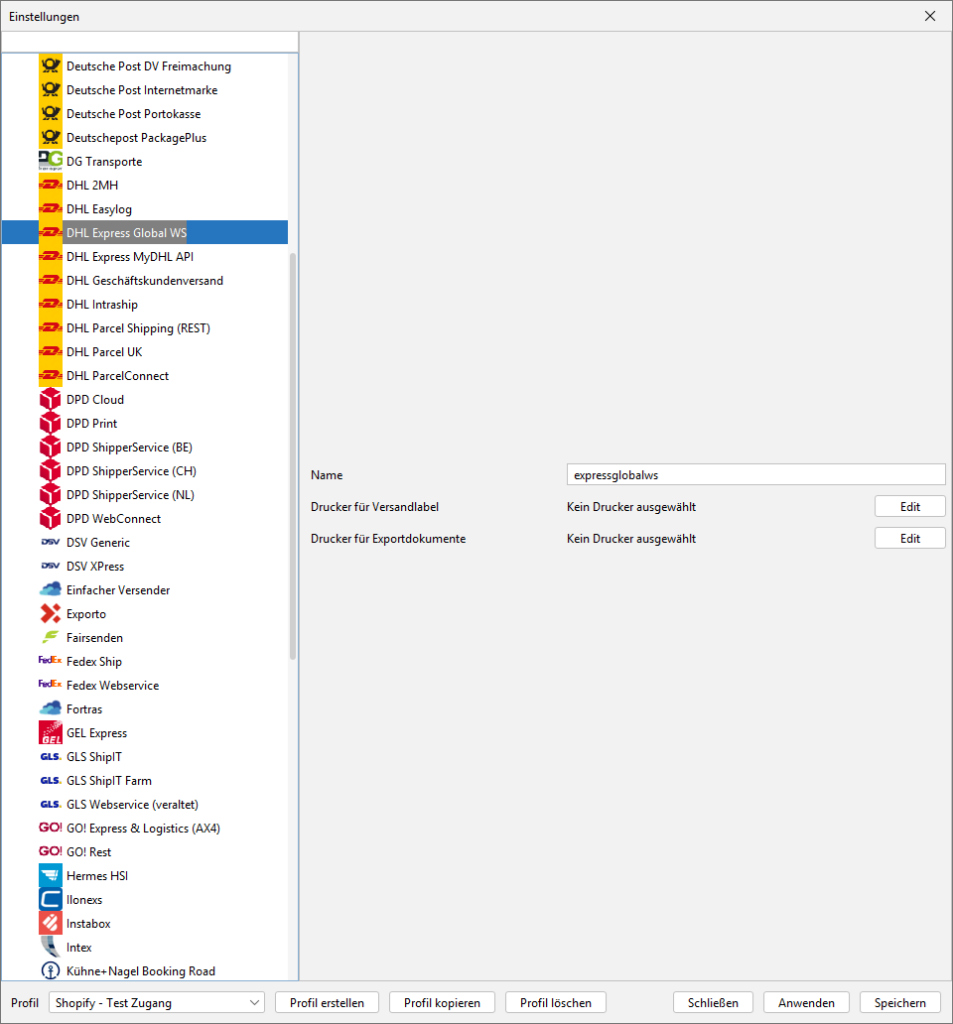 Verbinde dein aktuelles Profil mit dem gewünschten Versender auf dem Reiter „Allgemein“ unter dem Punkt „Standard Versender“. Danach wähle im BCS-Menü das entsprechend Modul aus unserer Versenderliste.