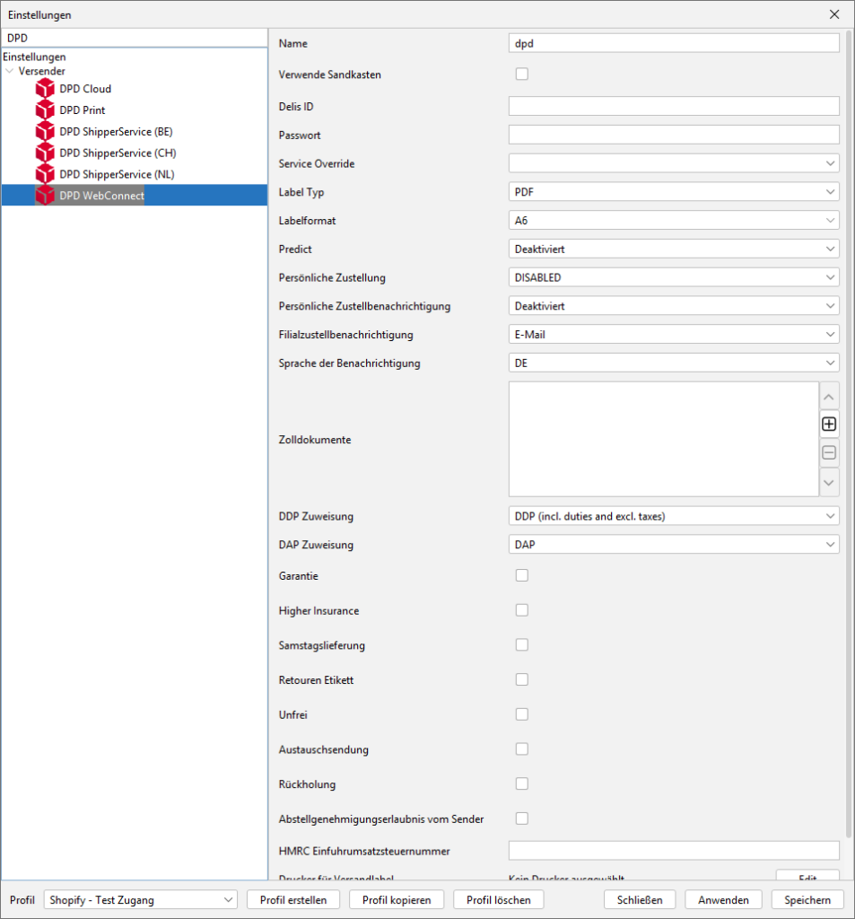 Aktiviere diese Checkbox, wenn du von DPD-Testzugangsdaten erhalten hast.