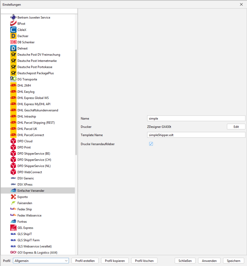 Konfiguriere hier den Drucker für Versandlabel.