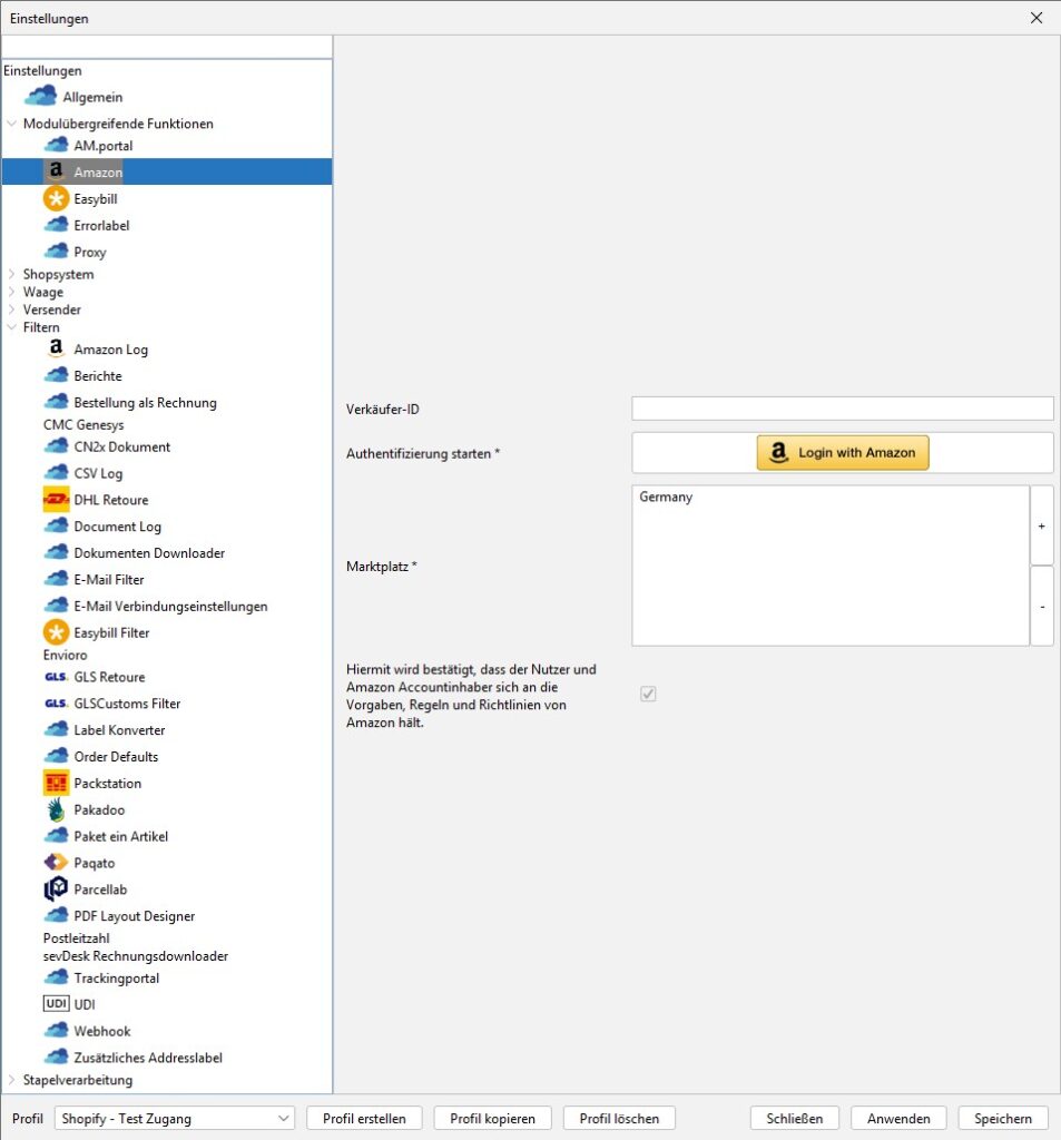 Dieses Modul wird ausschließlich zur Anmeldung an deinen Amazon-Account verwendet. Mit dieser Anmeldung funktionieren automatisch das Amazon-Shop-Modul, sowie die Amazon-Versender-Module.