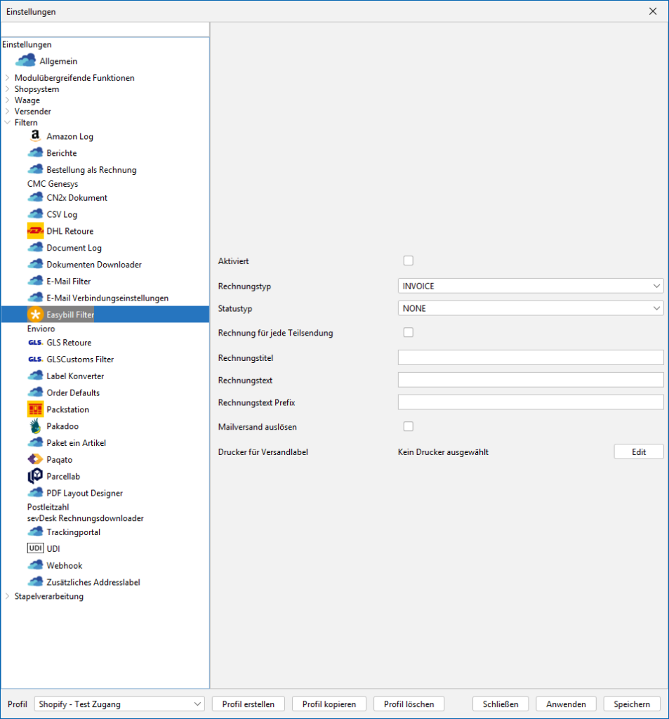 Aktiviere hier den EASYBILL-Filter für das ausgewählte Profil.