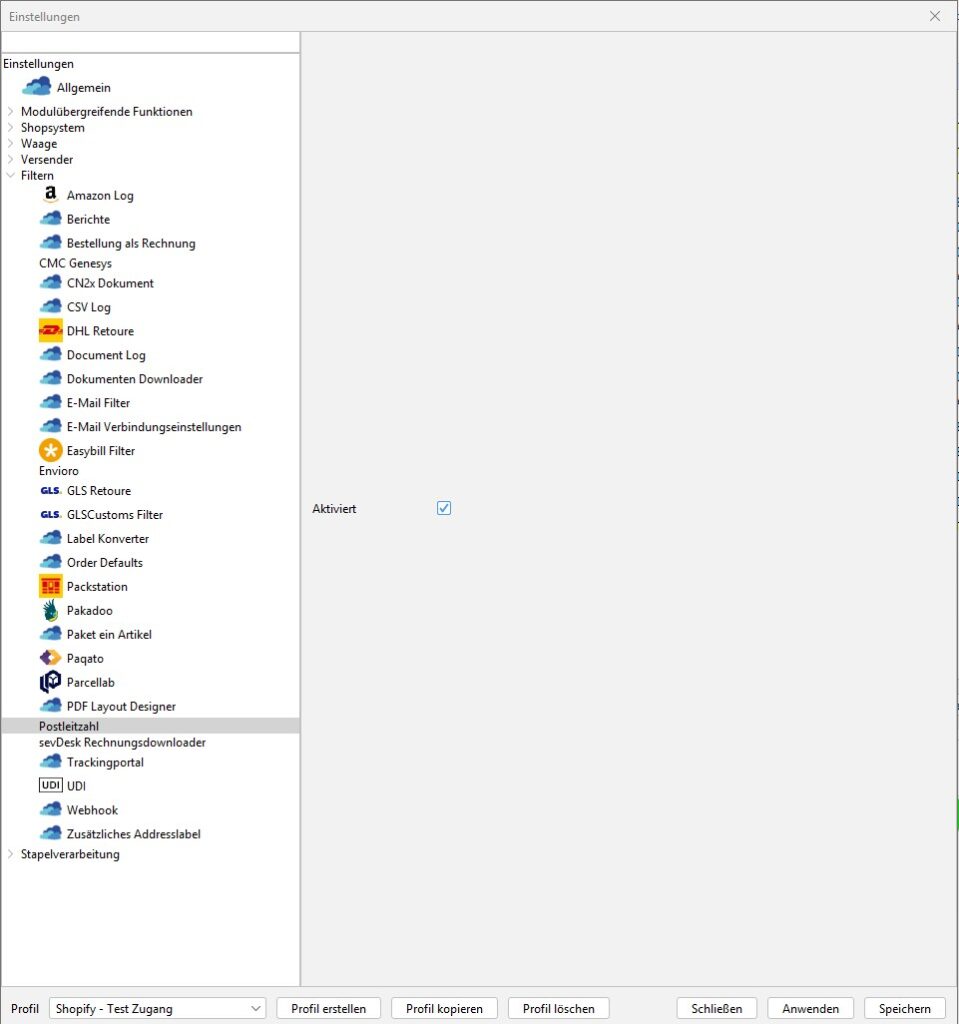 Solltest du den Automatismus nicht wünschen, das Modul aber bereits mit installiert haben, öffne im BCS-Menü über Datei das Einstellungsfenster. Navigiere zu Filter und aktiviere den Eintrag Postleitzahlen. Im rechten Fenster kannst du die Checkbox deaktivieren und unten rechts auf Anwenden bzw. Speichern klicken. Wiederhole diesen Schritt für jedes deiner Profile.