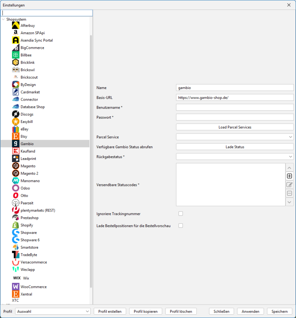 Klicke, nach Eingabe der Zugangsdaten, auf diesen Button, um die in deinem Gambio-Shop hinterlegten Paketdienste zu laden.
