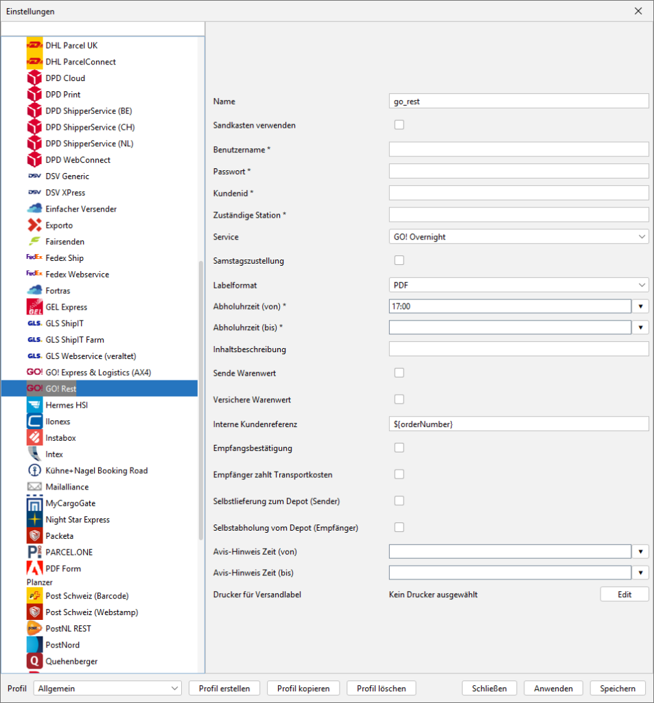 Verbinde dein aktuelles Profil mit deinem gewünschten Versender auf dem Reiter „Allgemein“ unter dem Punkt „Standard Versender“. Danach wählst Du im BCS-Menü das entsprechend Modul aus unserer Versenderliste.
