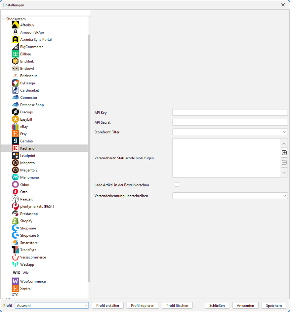 Verbinde dein aktuelles Profil mit dem gewünschten Shop auf dem Reiter „Allgemein“ unter dem Punkt „Standard Shop“. Danach wählst du im BCS das entsprechende Modul aus unserer Shopliste für weitere Konfigurationen.