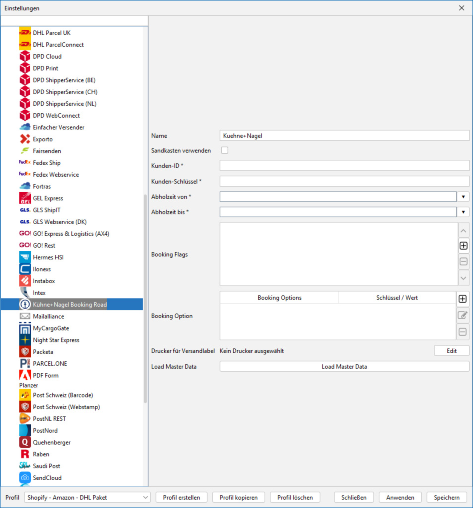 Verbinde dein aktuelles Profil mit deinem gewünschten Versender auf dem Reiter Allgemein unter dem Punkt Standard Versender. Danach wähle im BCS-Menü das entsprechende Modul aus unserer Versenderliste aus.