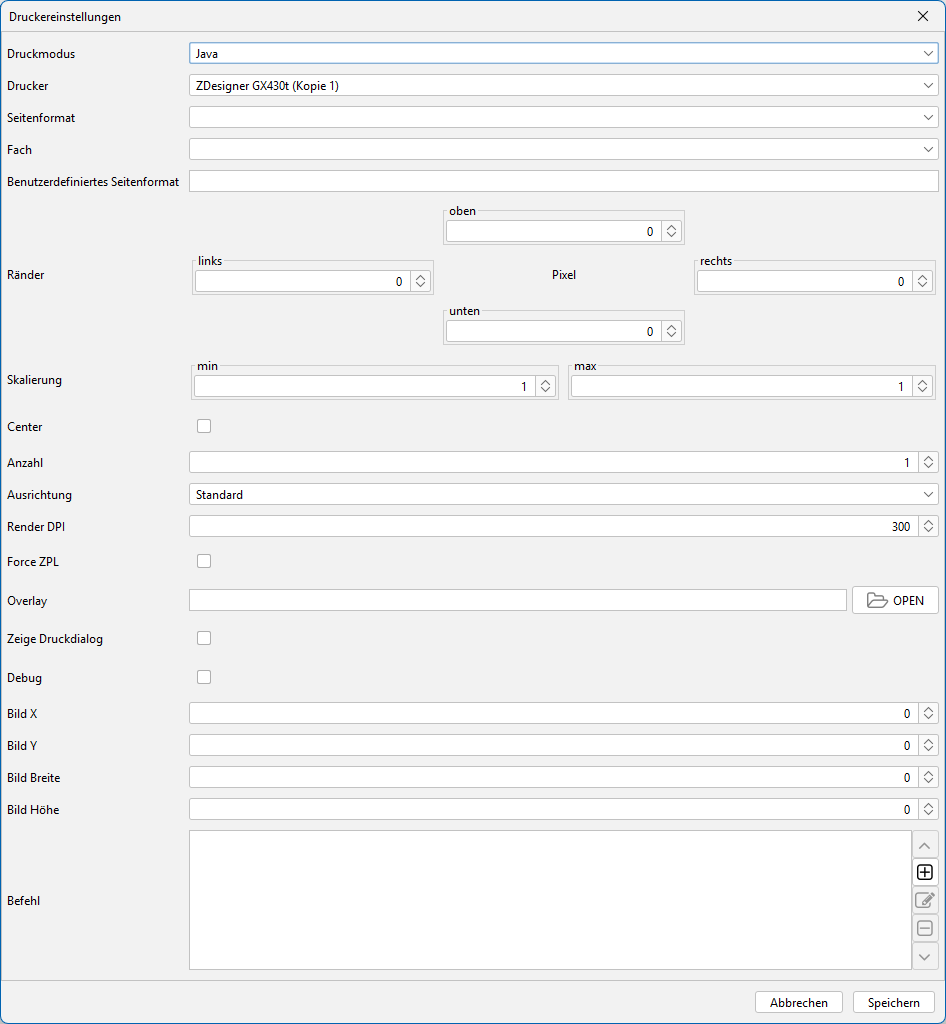 Trage hier ein, wie die Auflösung an deinen Drucker gesendet wird. Für ZPL-Drucker und erhaltene ZPL-Label wichtig. Dann natürlich abhängig von deinem Drucker.