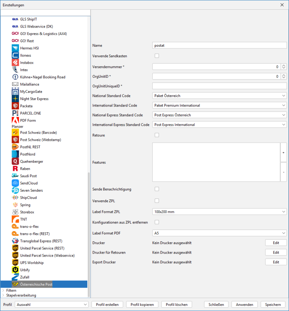 Verbinde dein aktuelles Profil mit deinem gewünschten Versender auf dem Reiter Allgemein unter dem Punkt Standard Versender. Danach wählst du im BCS-Menü das entsprechende Modul aus unserer Versenderliste.