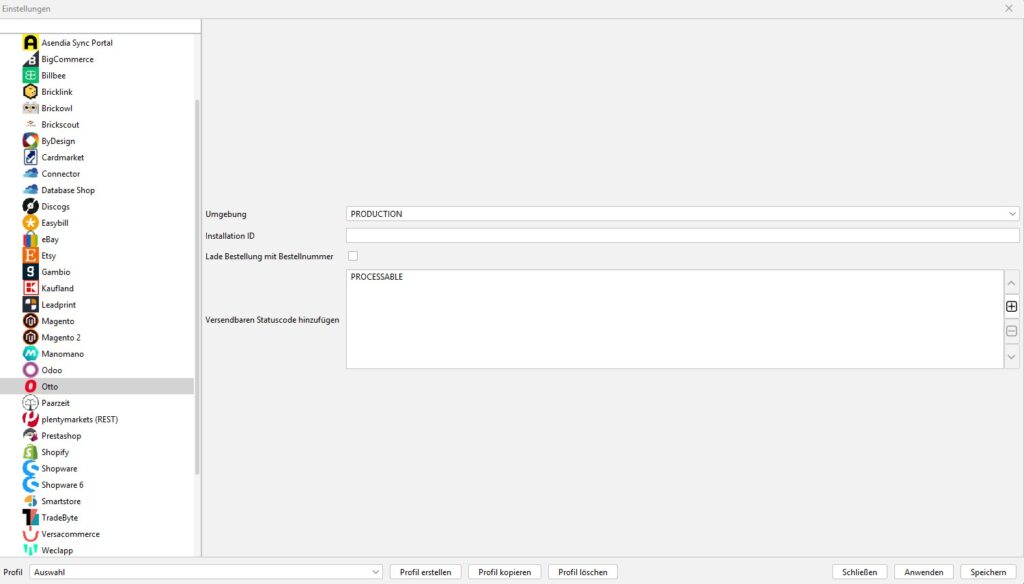 2. Öffne BarcodeShipping auf deinem Rechner und wähle das Profil aus, in dem dein OTTO-Shop angebunden werden soll. Die Konfigurationsseite des OTTO-Moduls muss aber geschlossen bleiben!
