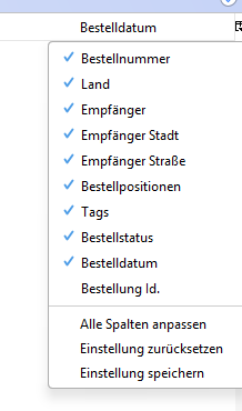 Ein blauer Haken vor dem Spaltenname bedeutet, dass diese Spalte aktiv ist, also angezeigt wird.