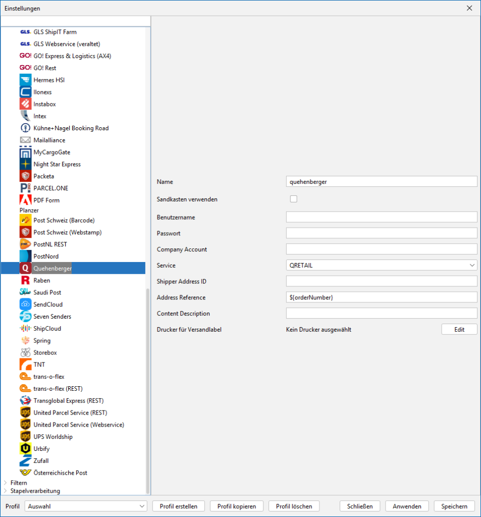 Verbinde dein aktuelles Profil mit deinem gewünschten Versender auf dem Reiter Allgemein unter dem Punkt Standard Versender. Danach wählst du im BCS-Menü das entsprechende Modul aus unserer Versenderliste.