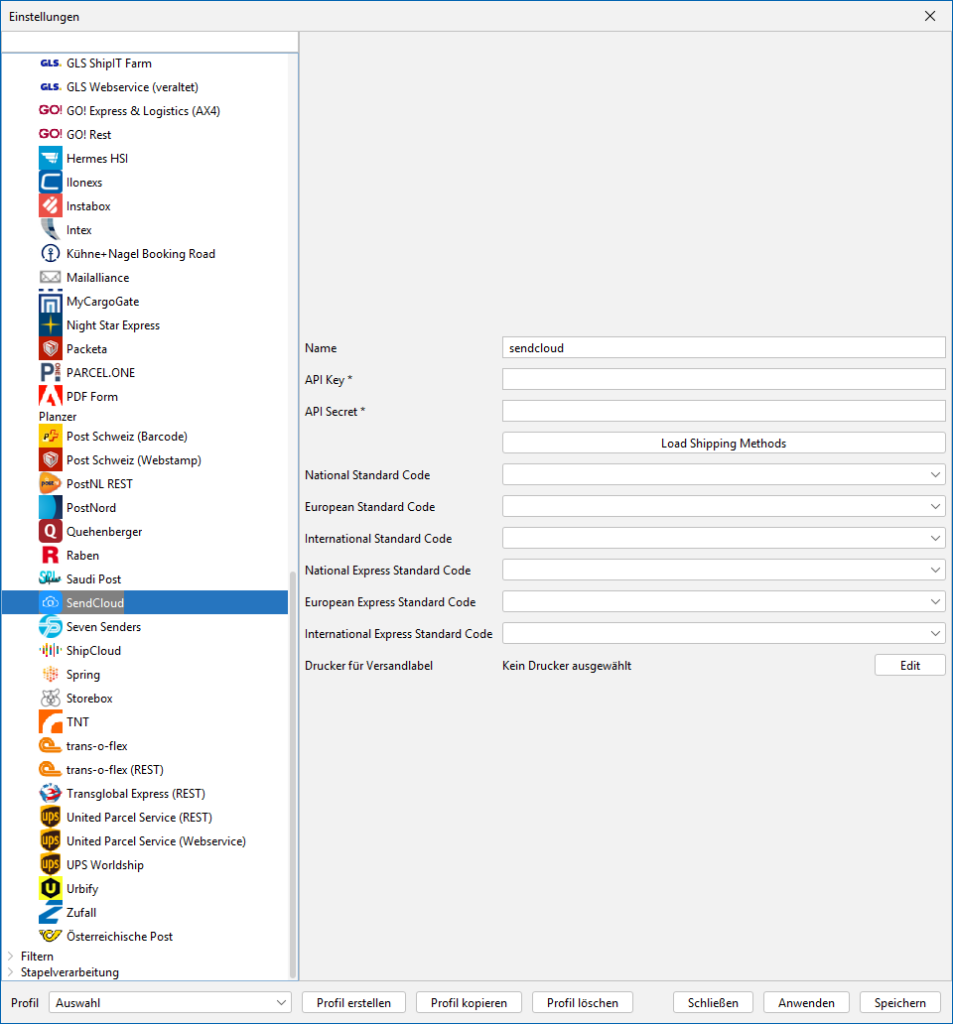 Verbinde dein aktuelles Profil mit deinem gewünschten Versender auf dem Reiter Allgemein unter dem Punkt Standard Versender. Danach wählst du im BCS-Menü das entsprechende Modul aus unserer Versenderliste.
