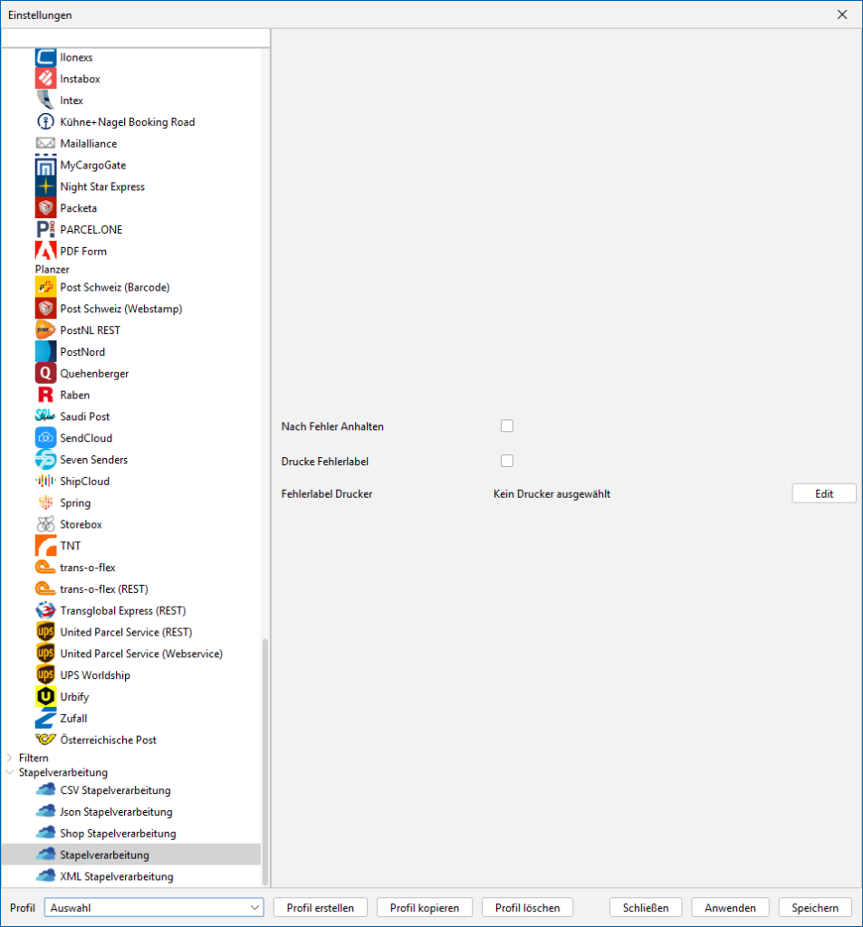 Aktiviere diese Checkbox, wenn die Stapelverarbeitung bei einem Fehler anhalten soll, z.B. wenn der Versender ein Problem mit den übermittelten Daten zurück gibt.