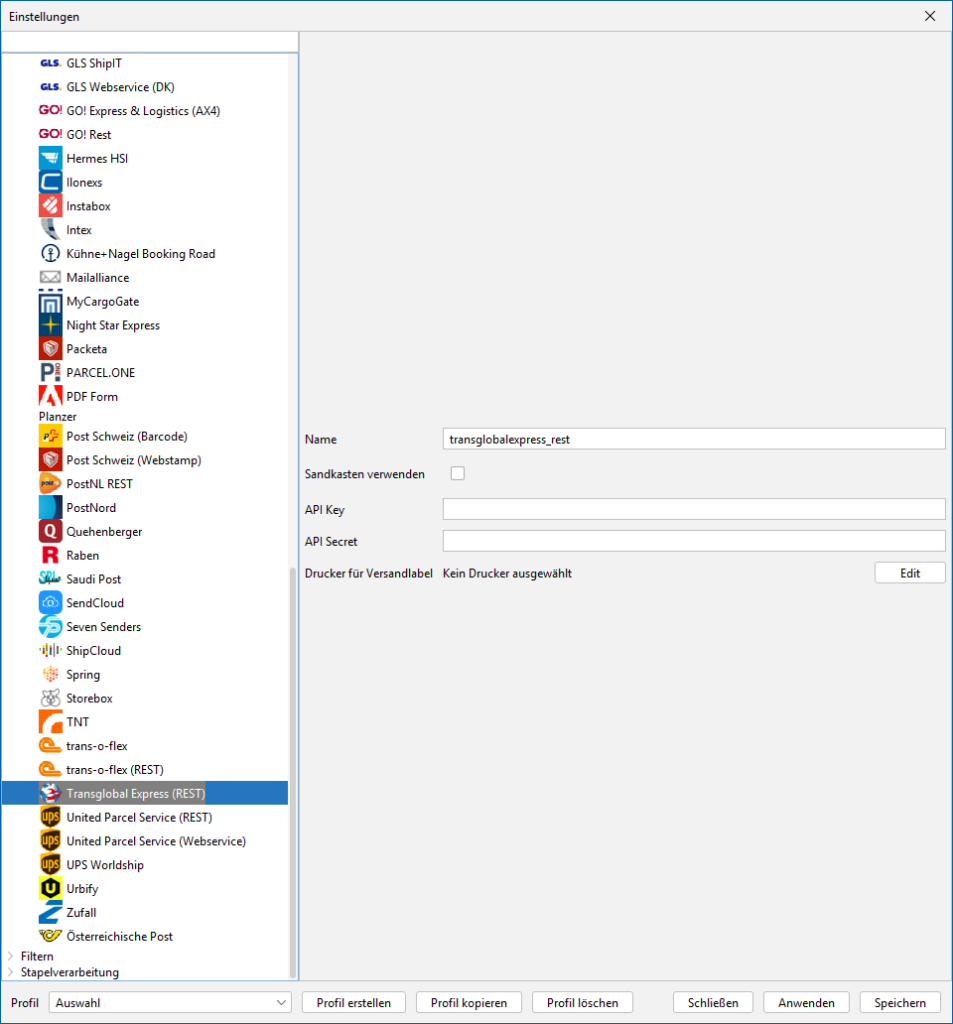 Verbinde dein aktuelles Profil mit deinem gewünschten Versender auf dem Reiter Allgemein unter dem Punkt Standard Versender. Danach wählst du im BCS-Menü das entsprechende Modul aus unserer Versenderliste.