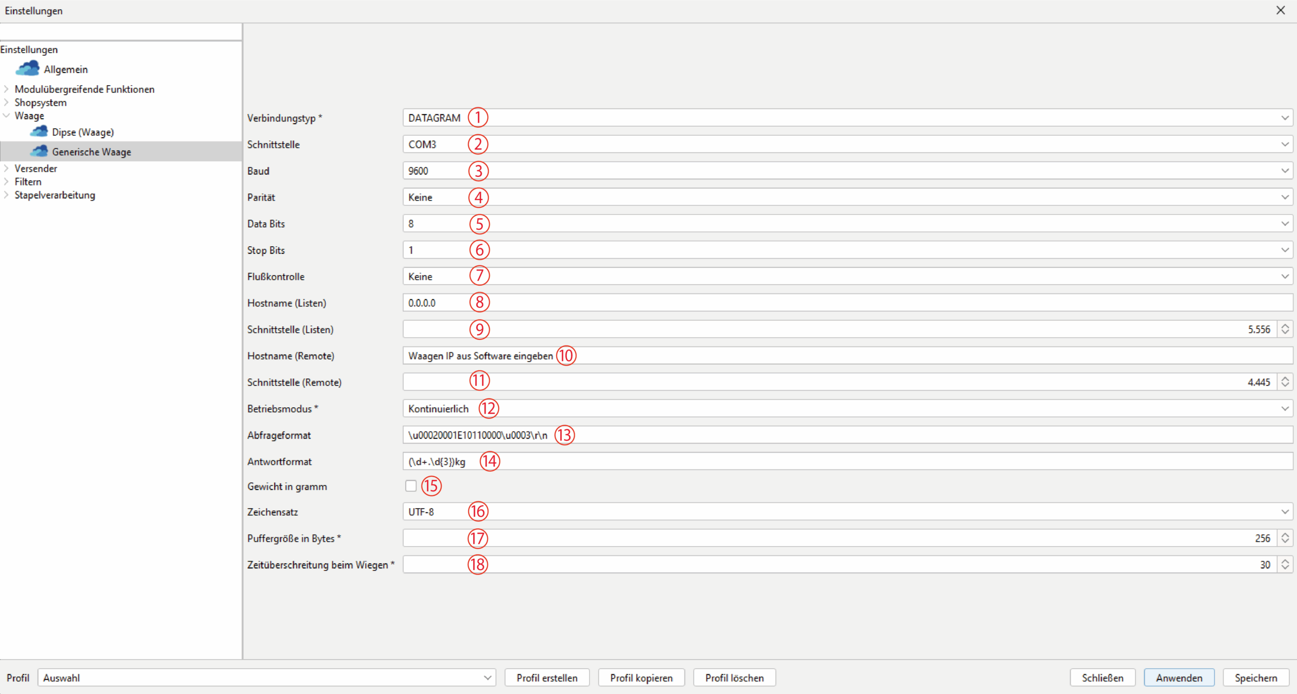 Die Einstellung sollte auf Generische Waage eingestellt sein.